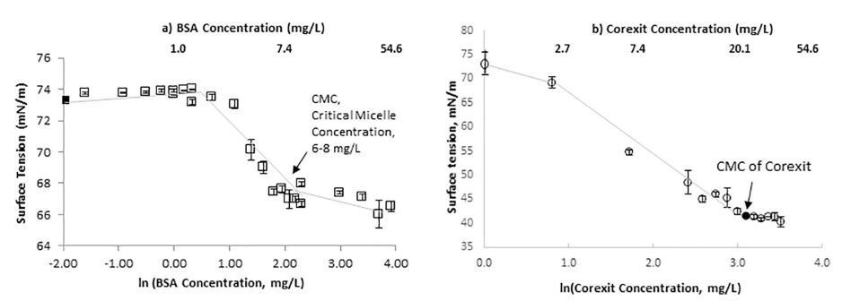 圖 4.a) 顯示了海水中模型蛋白質(zhì)的 SFT 作為其濃度自然對數(shù)的函數(shù)。 BSA 蛋白的 CMC 為 6–8 mg/L。 b) 顯示 Corexit 的 CMC 濃度為 22 mg/L。