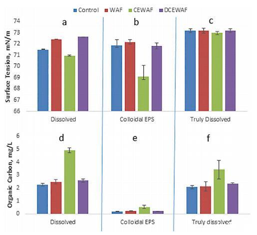 圖 2 中的有機碳表明大部分溶解的 部分,圖 2d,由低分子量碳組成,因為總?cè)芙獠糠郑瑘D 2f,幾乎等于 有機碳濃度中的溶解分數(shù)。 膠體 餾分(圖 2e)表明超濾已去除了 85% 到 95% 的 溶解部分的有機碳。 這可能表明 5% 到 15% 的 CEWAF 可能保留在 EPS 膠體部分中, 表明 SFT 的降低(圖 2b)也受 Corexit 的影響 和 WAF。 然而,使用 SFT 與 Corexit 濃度數(shù)據(jù), 圖 4b,即使是 15% 的 Corexit 也無法解釋 在圖 1 的 CEWAF 處理中測量的 SFT 降低。
