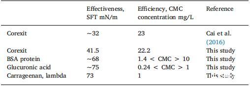 表 2 SFT 和 CMC 比較模型蛋白質(zhì)和酸性多糖。 雖然Corexit 更有效地降低 SFT,EPS 模型成分更有效 因為需要低得多的濃度才能開始乳化(蛋白質(zhì))和 穩(wěn)定成分(酸性多糖;結(jié)合大分子并添加 粘度)。