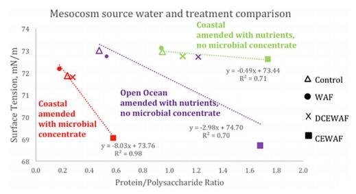 EPS 膠體溶液的 SFT 與 蛋白質(zhì)(更疏水)到多糖(更親水) 集中度,可以作為整體的相對度量 膠體部分的疏水性。 此外,圖1中的數(shù)據(jù) 意味著石油和/或 Corexit 的存在導(dǎo)致增強 EPS 膠體的蛋白質(zhì):多糖比率,但降低了 膠體部分的 SFT。 CEWAF 中蛋白質(zhì)含量較高 處理對應(yīng)的細菌計數(shù)高于其他處理 治療(Kamalanathan 等人,2018 年;Doyle 等人,2018 年)。 DCEWAF 還具有更高的蛋白質(zhì)含量和更高的蛋白質(zhì):多糖 比 WAF 和對照處理。 值得注意的是,當(dāng) 與不同的中宇宙實驗相比,開闊的海洋中宇宙的油濃度高兩倍,相對 DCEWAF 處理中的 Corexit 含量較高,即它們僅 ~6.3 倍稀釋的 CEWAF,而 DCEWAF 處理來自 用微生物濃縮物修正的沿海水域約 15 倍 稀釋的 CEWAF 和經(jīng)過修正的營養(yǎng)物質(zhì)的沿海水域是 ~ 10 倍稀釋的 DCEWAF(表 1)。 因此,趨勢線的斜率 可能受到 DCEWAF 中 Corexit 數(shù)量的影響,并且 CEWAF 處理 SFT 和蛋白質(zhì):多糖 比率。 由于其表面活性劑特性,Corexit 降低了 SFT,但它 還增強了蛋白質(zhì)的產(chǎn)生,導(dǎo)致比對照和 WAF 處理更高的蛋白質(zhì):多糖比率。 這 相對 SFT 和蛋白質(zhì):對照和 WAF 的多糖位置 可能是由膠體和海水的組成和濃度的微小差異產(chǎn)生的。