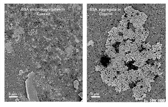 相同放大倍數(shù)下 BSA 聚集體的 SEM 圖像(圖 3b) 在 Corexit(左)和 ASW 中用 0.1% BSA 溶液制備 來自與圖 3a 中相同的溶液的對照處理(右)。 這 Corexit 處理(左圖 3b)顯示來自液體的微聚集體 階段。 對照處理(圖 3b 右)顯示了一個大結(jié)晶 蛋白質(zhì)聚集體。 圖 3a 和 3b 中描繪的結(jié)果支持 靜電相互作用和共價鍵作用的重要性 在微聚集體形成中(Corexit 與 Ca2+ 離子突出顯示 CTC) 和 Ca2+ 螯合中的配位共價鍵 CTC 和陰離子親水部分(CEWAF、WAF 和對照 處理)形成比 Corexit 更少但更大的聚集體 治療。