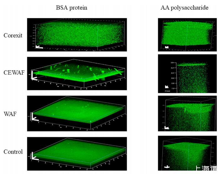 四種治療的共聚焦激光掃描顯微鏡 (CLSM) 帶有模型 EPS 組件的處理如圖 3 所示。 ASW 顯示在左側(cè) BSA 的 0.1% 垂直系列溶液中 右邊是一系列 0.1% 的海藻酸溶液。 橫向, 面板顯示了 Corexit、CEWAF、WAF 的相應(yīng)處理, 和對照,用于 BSA 和海藻酸溶液。 綠色熒光探針 CTC 突出顯示與陰離子結(jié)合的親水性 Ca2+ 多糖和蛋白質(zhì)的區(qū)域。 對于海藻酸和 BSA實驗,單獨使用Corexit就可以分散模型分子 無界面積聚。 圖像也顯示出明亮密集 微聚集體中較高傾向的綠色熒光 Corexit 比在其他治療中看到的要多。 海藻酸面板全部顯示 聚集體的分散,而 BSA 面板顯示主要在界面處的蛋白質(zhì)。 CEWAF 海藻酸和 BSA 可以生成 清晰的界面層。 CEWAF 中的 BSA 顯示聚合 當(dāng)它們向上擴散時在垂直方向上被夸大 隨著圖像曝光的時間。 此外,BSA CEWAF 顯示聚集體似乎在液體表面上方,因為它們是 在未顯示的泡沫層之內(nèi)和之上。 具有主要親水部分的控制處理表現(xiàn)出較少的分散 和不太明顯的界面層。 雖然垂直尺度較小 對于 BSA 圖像比對于海藻酸圖像,仍然很明顯 海藻酸分散在整個體積中,而 BSA 迅速擴散到界面。 唯一的例外是 Corexit 處理顯示沒有界面積聚和完全分散 海藻酸和BSA。