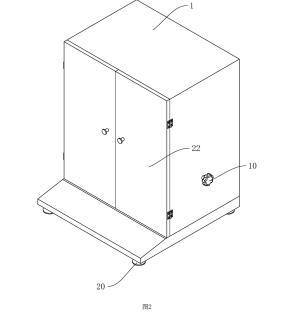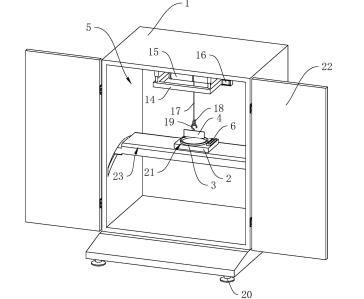 參照圖1,包括殼體1、工作臺(tái)2、盛液盒3和標(biāo)準(zhǔn)板4,殼體1內(nèi)設(shè)置有工作腔5,殼體1底部設(shè)置有多個(gè)支撐腳20,在本申請實(shí)施例中,支撐腳20設(shè)置為四個(gè),四個(gè)支撐腳20設(shè)置于殼體1的四角位置;殼體1上鉸接有兩轉(zhuǎn)動(dòng)門22;工作臺(tái)2設(shè)置于工作腔5內(nèi),工作臺(tái)2上開設(shè)有與盛液盒3適配的放置槽21,盛液盒3可放置于放置槽21中,標(biāo)準(zhǔn)板4設(shè)置于盛液盒3上方,標(biāo)準(zhǔn)板4通過升降結(jié)構(gòu)可升降連接于殼體1上,工作臺(tái)2上固定連接有水平儀6,在本申請實(shí)施例中水平儀6選用氣泡式水平儀,也可選擇其他體積較小的水平儀;工作臺(tái)2和殼體1之間設(shè)置有用于調(diào)平工作臺(tái)2的調(diào)平結(jié)構(gòu)。