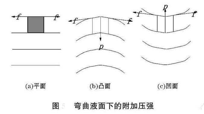 如果熔體表面是凸面,如圖3b所示,因表面張力沿周界與熔體面相切,則沿周界各個方向的表面張力f將產(chǎn)生一個指向熔體內(nèi)部的合力p(正壓力),使得熔體表面曲率變小。如果液面是凹面,如圖3c所示,表面張力的合力將指向熔體外部,對熔體則產(chǎn)生一個負(fù)壓力,使得凹面變平,甚至有可能轉(zhuǎn)化為凸面。由于表面張力的作用,熔體表面能夠截凸補(bǔ)凹,自動修復(fù),表面平滑,這正是陶瓷釉層表面能夠平整光滑的主要原因。