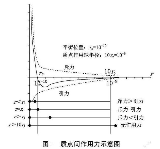 由熔體作用力理論可知,組成熔體的質(zhì)點(diǎn)間存在著作用力。當(dāng)質(zhì)點(diǎn)處于平衡位置時,即質(zhì)點(diǎn)間距r=r0(r0=10-10)時,引力等于斥力,質(zhì)點(diǎn)間作用力為0;質(zhì)點(diǎn)間距r>r0,作用力為引力;質(zhì)點(diǎn)間距r<r0,作用力為斥力;當(dāng)質(zhì)點(diǎn)間距r>10r0時,引力和斥力均為0,如上圖所示。