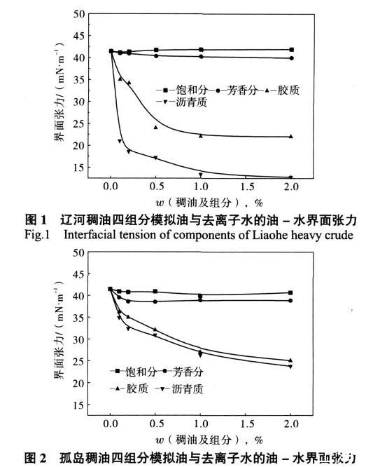 (1)遼河稠油組分中的芳香共軛成分以及含氧、氮的極性基團均大于孤島稠油組分,其界面活性也強于孤島稠油的。