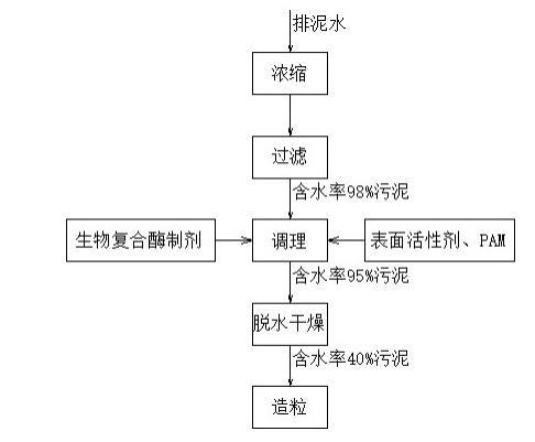 經(jīng)純水稀釋后以0.008%比例和用自來水配置的濃度為0.1%的陰離子聚丙烯酰胺(分子量為800-1000萬)溶液加入到步驟S2中的混合料2中,以60r/min速度均勻攪拌,調(diào)理15min后得到含水率為95%的混合料3;