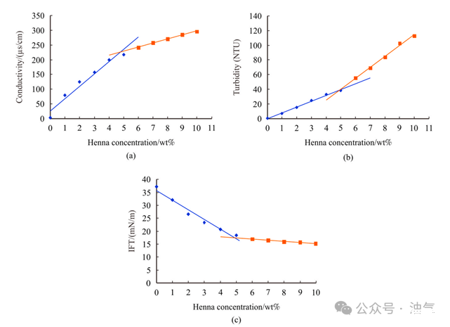 圖1.(a)電導率、(b)濁度和(c)界面張力隨指甲花溶液濃度的變化