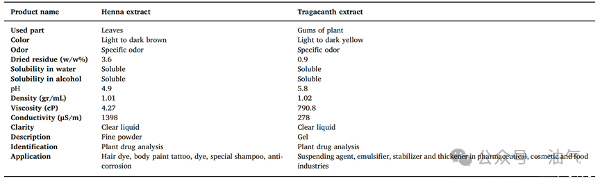 表1.指甲花和黃芪膠提取物的物性