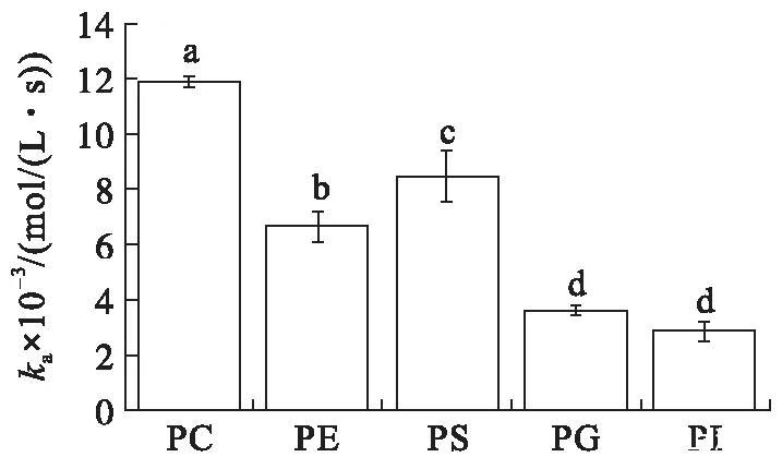 在初始表面壓力為25 mN/m的條件下(見圖4),VhPLD對PC的吸附常數最大((1.46±0.10)×104mol/(L·s)),對于PG((3.58±0.31)×103mol/(L·s))和PI((4.30±0.34)×103mol/(L·s))的吸附常數最小。在該初始表面壓力條件下,VhPLD對于PC、PE和PS的解離常數之間不存在顯著差異(P>0.05),該結果與在15 mN/m所測定的結果保持一致。而在該條件下獲得的VhPLD對不同磷脂單分子層吸附偏好性順序為PC>PS>PI>PE=PG。