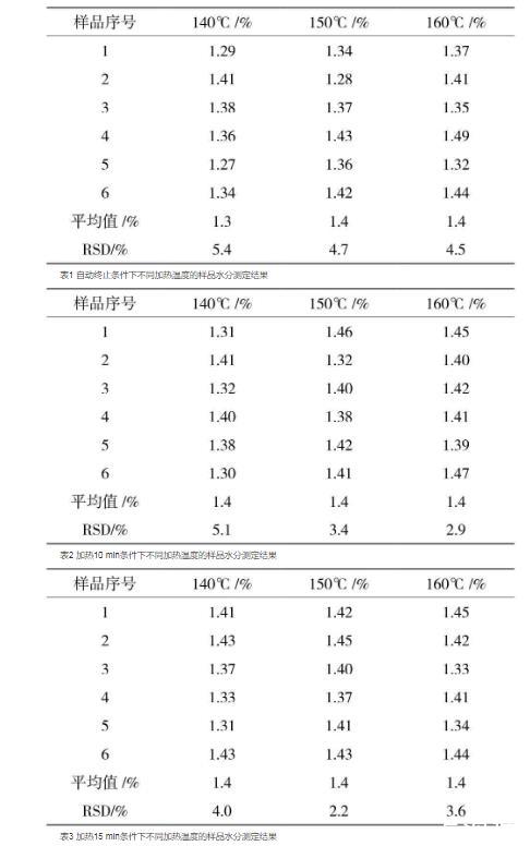 表1自動終止條件下不同加熱溫度的樣品水分測定結果