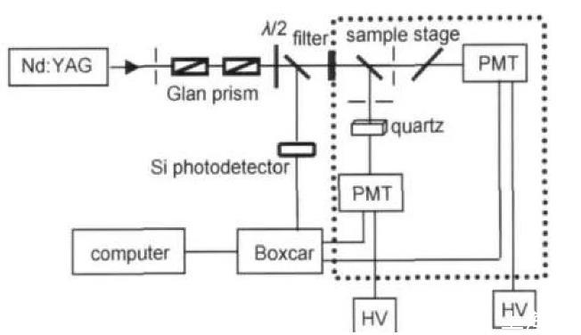 LB膜樣品和標準石英晶體的二次諧波信號由光電倍增管(PMT)探測,通過Boxcar門積分器采集后輸入到計算機中進行數(shù)據(jù)處理。PMT前放置了隔紅濾光片和只透532 nm的干涉濾光片,以保證只有532 nm的光可以進入到PMT中。圖中,filter為透1064 nm的濾光片,以保證只有1064 nm的基頻光進入黑暗的封閉空間,照射到樣品上。Si photodetector為硅光探測器。Sample stage為可繞其法線旋轉的樣品臺,其旋轉角度可從0°到360°連續(xù)變化,以改變基頻入射光入射角的大小。HV是高壓電源,可以為光電倍增管提供1300 V的高電壓。