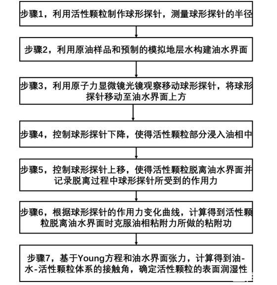 步驟7,利用界面張力儀測量油相與水相之間的界面張力,基于Young方程,結(jié)合球形探針的半徑以及球形探針的下降高度,計(jì)算得到油-水-活性顆粒體系的接觸角,確定活性顆粒的表面潤濕性。