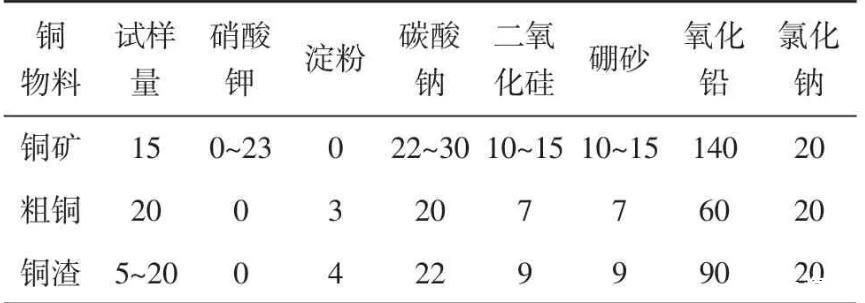 配料前可根據(jù)待測物組分確定熔渣的硅酸度,然后計算各熔劑的需要量。同時根據(jù)試樣還原力試驗結(jié)果(或理論計算試樣的還原力)調(diào)整氧化劑或還原劑加入量。通過優(yōu)選實驗,推薦含銅物料的配料可按表1進(jìn)行。