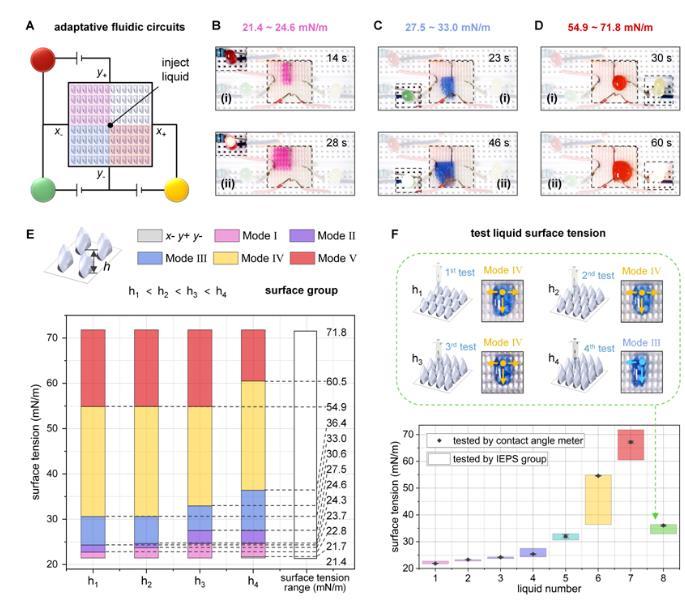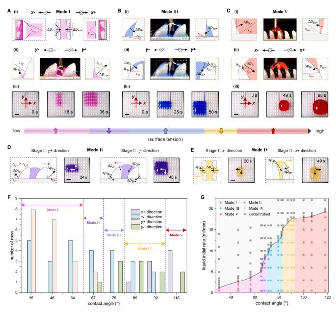 注入結構化表面的液體首先填充相鄰四個單元間的空隙,并在單元的特定曲率結構處形成局部曲率不等的液體彎月面,這導致液體表面不同位置的拉普拉斯壓差不同,進而驅動液體定向運輸。隨表面張力從低到高(22-72 mN/m),液體呈現出五種不同的運輸模式(I至Ⅴ)。研究人員利用水-乙醇溶液對這五種模式下液體沿x軸和y軸方向上的運輸行為進行力學分析(圖2)。表面張力較低的液體對界面的潤濕性較高,因此主要在單元底部曲率結構作用下,沿拉普拉斯壓差較低的方向運輸;而表面張力較高的液體會在結構化表面上積累,其運輸方向由單元頂部曲率調控。