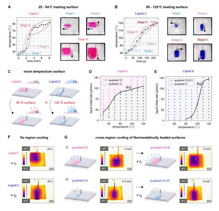 在熱交換應用中,溫度導致的液體性質變化是一個廣泛存在的現象,給傳統的液體操縱表面在高溫環境下的應用帶來了挑戰。本研究提出的結構化表面能在高溫環境下有效維持對液體的定向運輸。并在高溫導致的液體表面張力變化下,完成了在持續變溫表面上對液體運輸方向的智能調控,和在恒溫加熱表面上時空可控的靶向冷卻(圖4)。這種基于溫度調控液體性質的智能液體運輸能力,為按需熱管理提供了新的解決方案。