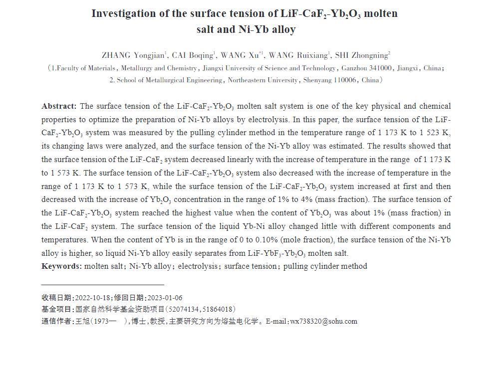 > LiF-CaF?-Yb?O?熔鹽體系表面張力的測定及其對Ni-Yb合金電解的指導意義(二)