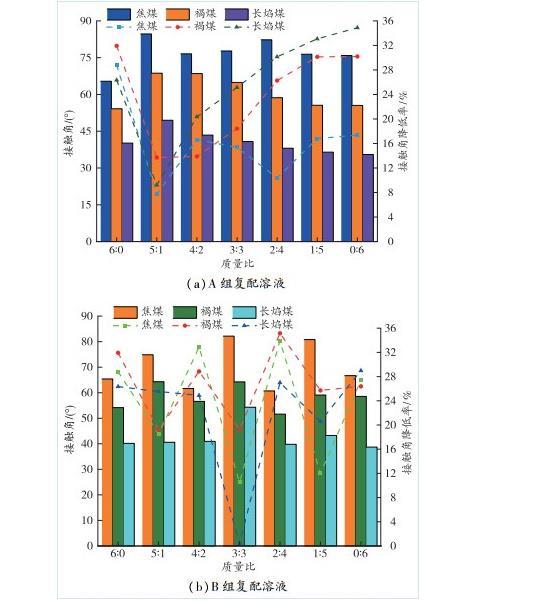 1)與純水相比,復配后的A、B 2組溶液的接觸角明顯降低,對于焦煤、褐煤、長焰煤,B組溶液復配質量比為2∶4時接觸角降低最多,分別為31.131%,27.969%、14.713%;對于焦煤,A組溶液復配質量比為6∶0時接觸角降低最多,為26.452%,對于褐煤、長焰煤,A組溶液復配質量比為1∶5時接觸角降低最多,為25.982%、20.026%。