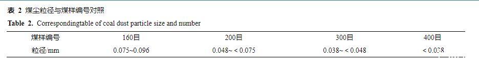 將EMI原液稀釋至質量分數分別為0.1%、0.2%、0.4%、0.6%、0.8%、1.0%、2.0%、4.0%、6.0%、8.0%的混合溶液。實驗煤樣選取黃陵一號煤礦弱黏煤樣,煤樣工業分析結果見表1。在制備煤塵樣品時,根據有關文獻對黃陵一號煤礦綜采工作面煤塵粒徑分布進行檢測,并結合國際標準化組織對粉塵粒徑的定義,以及實驗室制備條件,去除煤塊外表皮,使用破碎機對煤心破碎60 s,用160、200、300、400目標準工業篩對煤粉進行篩分,共篩分出0.075~0.096、0.048~<0.075、0.038~<0.048、<0.038 mm共4個粒度范圍的樣品進行實驗,其中煤塵粒徑與煤樣編號見表2。煤樣制備完成后,將其放入80℃的真空干燥箱,真空干燥8 h后密封保存以備實驗使用。