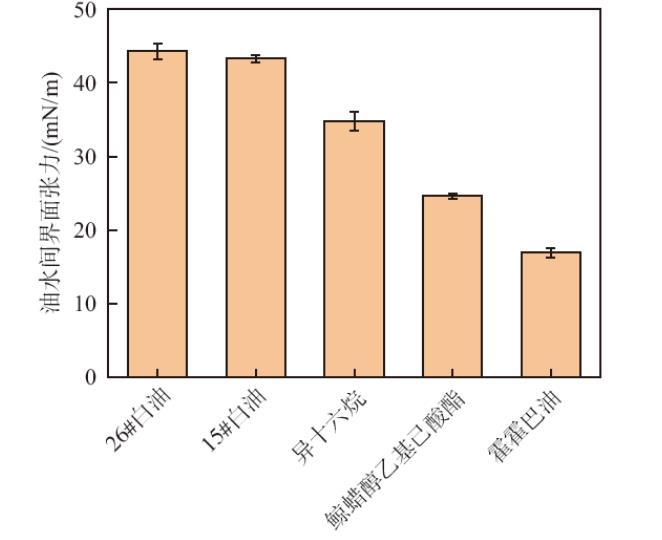 油水間的界面張力(γ0)可以用來表征油和水分子之間的內聚性或混溶性,被證實是表征油相極性的可靠指標。隨著油水間的界面張力減小,油相的極性增大。如圖1所示,油水間界面張力為26#白油(44.3±1.1),15#白油(43.3±0.5),異十六烷(34.8±1.3),鯨蠟醇乙基己酸酯(24.6±0.4),霍霍巴油(16.9±0.6)。因此,不同油脂的極性大小順序為:霍霍巴油>鯨蠟醇乙基己酸酯>異十六烷>15#白油>26#白油。查閱相關文獻可知,霍霍巴油和鯨蠟醇乙基己酸酯為極性油脂,而26#白油、15#白油和異十六烷為非極性油脂。