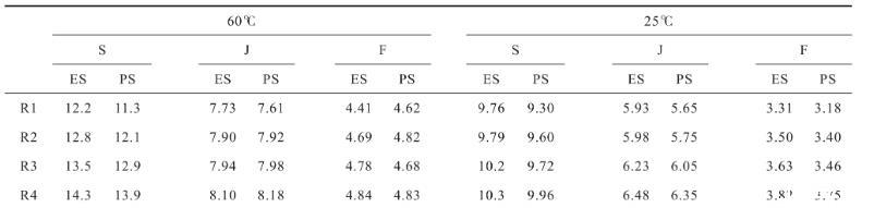 表2為三種試樣最終收縮開(kāi)裂裂隙度的相關(guān)研究結(jié)果。從表2可以看出,同組試驗(yàn)各平行樣的最終收縮開(kāi)裂裂隙度基本一致,說(shuō)明該試驗(yàn)具有良好的可重復(fù)性。60℃條件下純水(S樣)的四次干濕循環(huán)最終平均δ分別為11.8%、12.4%、13.2%、14.1%,酒精溶液(J樣)分別為7.7%、7.9%、8.0%、8.1%,肥皂水(F樣)分別為4.5%、4.6%、4.7%、4.8%;25℃條件下S樣的四次干濕循環(huán)最終平均δ則分別為9.5%、9.6%、9.9%、10.1%,J樣分別為5.8%、5.9%、6.1%、6.4%,F(xiàn)樣分別為3.2%、3.4%、3.5%、3.7%。可見(jiàn),在同種溫度條件下,同組試樣的最終δ隨著干濕循環(huán)次數(shù)的增加而增大;而在不同溫度條件下,同組試樣的最終δ同樣隨溫度的增加而增加,取第四次循環(huán)來(lái)看,60℃條件下的純水、酒精溶液和肥皂水試樣的最終δ分別較25℃條件下的高4.0%、1.7%和1.1%。將25℃和60℃條件下的最終δ進(jìn)行對(duì)比,不論何種溫度條件下,純水樣的最終δ大于酒精溶液樣和肥皂水樣的最終δ;其中,酒精溶液樣的最終δ大于肥皂水。