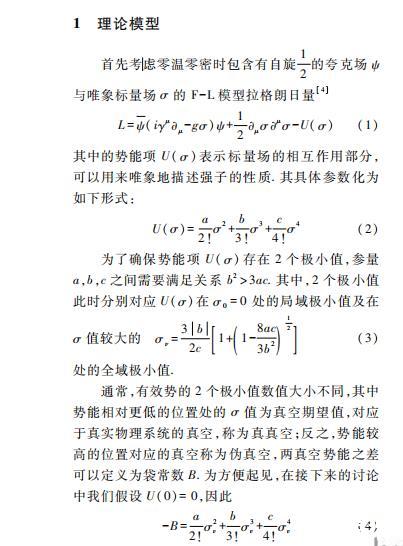 本文具體采用的模型是具有夸克禁閉性質的Friedberg-Lee模型(F-L Model)。F-L模型最初用于描述低能時強子的行為,將強子看做真空中的袋狀孤子解,為QCD理論中的禁閉行為提供了非常直觀的物理解釋。不僅如此,該模型也被擴展至有限溫度密度下夸克物質的退禁閉相變的研究,提供了研究夸克強子相變性質的有利手段。但是該模型只能給出有限溫度密度下夸克物質一級相變的結果,無法討論平滑過渡(Crossover)相變和相臨界截點相關的物理問題,具有一定局限性。不過本文主要研究夸克強子一級相變下氣泡或液滴的動力學問題,F-L模型是比較合適的模型。