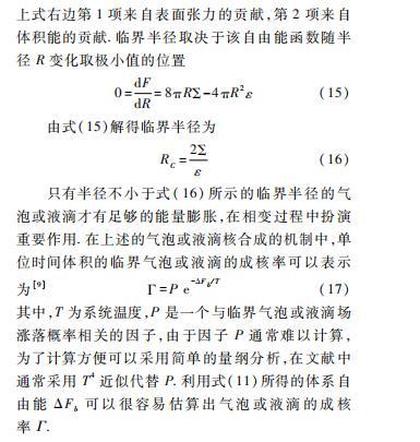 時~R3的效應更明顯。對于由漲落產生的半徑小于某一特定半徑Rc的氣泡或液滴,表面張力的效應強于體積能效應,其將在表面張力作用下不斷收縮直到消失;但對于半徑大于Rc的氣泡或液滴,體積能效應強于表面張力的效應,此時氣泡或液滴將不斷膨脹直至充斥整個空間,原本的偽真空背景將被真真空所取代,完成了相變過程。上述特殊的半徑Rc稱為臨界半徑。在我們所研究的體系中,我們主要考慮熱漲落效應而忽略量子漲落效應。