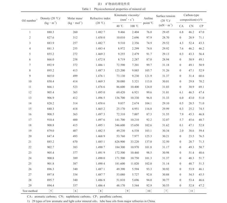 29種常見的低芳淺色礦物油:取自國內(nèi)主要煉油廠的潤(rùn)滑油基礎(chǔ)油,包括主要的石蠟基基礎(chǔ)油和環(huán)烷基基礎(chǔ)油,不包括深色高芳烴礦物油;從精制程度看,包括高壓加氫深度精制油品,也包括溶劑精制和白土精制工藝精制油品;從碳型結(jié)構(gòu)看,包括芳環(huán)碳(CA)含量為零的油品,也包括CA含量小于10%(w)的油品。礦物油的理化性質(zhì)見表1。