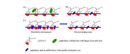 隨著時間的推移,界面上的活性分子由無序排列轉變為有序排列,如圖6(C)所示。在此過程中,界面活性分子的脫附速率大于吸附速率,界面濃度不斷減小,導致IFT升高直到脫附速率等于吸附速率。因此,DIFTs曲線呈“V”型。在此情況下,IFTmin不等于IFTequ.結果表明,小分子尺寸的瀝青質及其亞組分與P-S14-4分子的協同作用主要體現在瞬時的IFTmin值上。也可通過圖5證實,隨著A,A3和A4濃度的增加,IFTmin明顯降低,這表明隨著分子尺寸較小的瀝青質組分濃度的增加,混合吸附膜變緊密,協同作用增強。瀝青質主要通過與表面活性劑形成混合吸附膜和改變油相的性質來影響IFT。