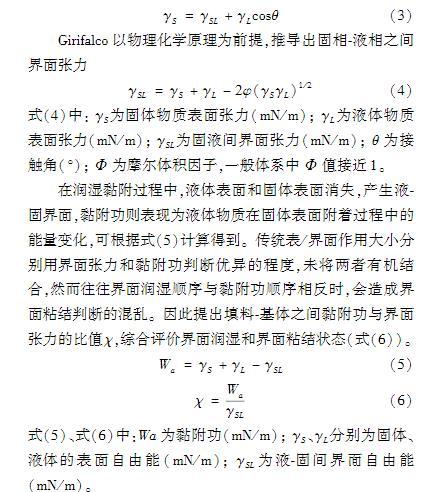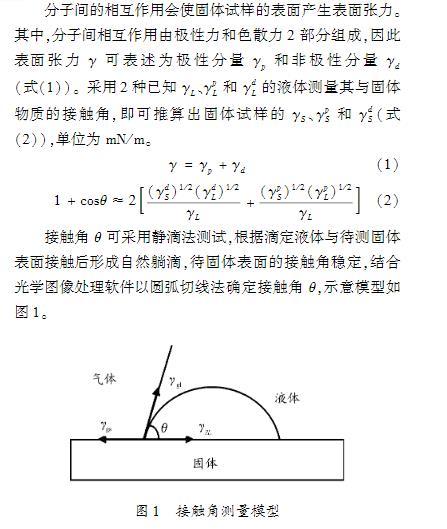 接觸角法屬于熱力學(xué)方法,以浸潤理論為基礎(chǔ),當(dāng)液體與固體填料表面接觸時達(dá)到浸潤平衡。YoungT以一種液體附著在另一種固體上作用力平衡為前提條件,提出了著名的楊氏方程