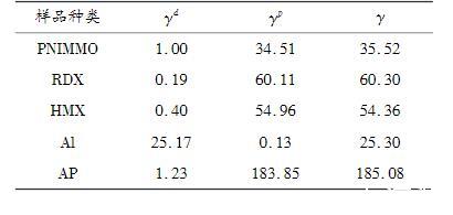 將表1中的接觸角測試結(jié)果代入式(2)中,利用Owens——Wendt——RabelandKaelble(OWRK)擬合得到PNIMMO及推進(jìn)劑組分的表面張力,如表2所示。5種樣品的表面張力大小順序為:γ(AP)>γ(RDX)>γ(HMX)>γ(PNIMMO)>γ(Al),其中PNIMMO、RDX、HMX和AP中表面張力的極性分量γp均遠(yuǎn)大于色散分量γd,說明其表面張力中極性分量貢獻(xiàn)更多;而相反Al粉表面張力中色散分量對其表面張力作主要貢獻(xiàn)。一般而言,當(dāng)粘合劑的表面張力小于推進(jìn)劑中單質(zhì)固體組分的表面張力時,粘合劑才能較好地包覆于推進(jìn)劑表面。PNIMMO的表面張力為35.52mN/m,明顯小于RDX、HMX及AP的表面張力,說明PNIMMO比較容易鋪展于其他固體物質(zhì)表面。即PNIMMO對RDX、HMX和AP3種固體組分的包覆效果良好。