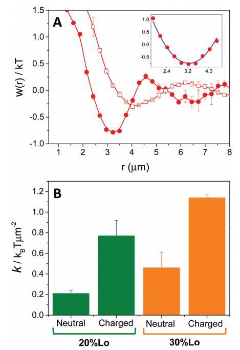 圖 4 (A) 域之間的平均力勢 w(r) 從 由帶電(圓圈)或 中性(正方形)域。 插圖:擬合實驗的例子 數(shù)據(jù)(藍色曲線)對應于 20%Lo 的帶電域。 (B) 春天 諧波電位常數(shù),通過擬合 w(r) 的第一個谷值獲得 為中性和帶電雙層的二次函數(shù)(見 A 中的插圖) 以指定的液體順序百分比。