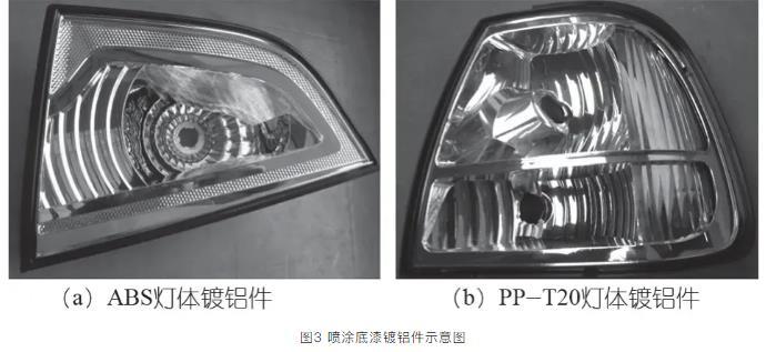 PP-T20和ABS表面張力都是較低,與鍍鋁層結(jié)合力較差,通過(guò)噴涂底漆獲得較好地表面張力,提高附著力。如圖3(a)所示為ABS材料加工汽車后霧燈體,ABS表面張力為34~38 mN/m,ABS是三元共聚物,內(nèi)在的成分比例有些差異,表面張力是個(gè)范圍值,可噴涂底漆(涂料低聚物環(huán)氧丙烯酸酯)改善ABS表面張力。