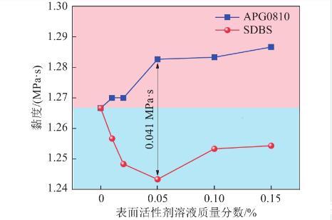 在質量分數為0.05%時兩種表面活性劑溶液黏度相差0.041 MPa·s,達到最大值,這是由于在該質量分數下SDBS溶液未形成膠束,且離子之間斥力最大,而APG0810溶液開始形成膠束,溶液內分子間碰撞概率變大。