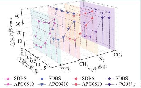 對比不同表面活性劑溶液在注入單一氣體條件下泡沫高度差異性進行分析,質量分數相同時,無論注入任何氣體,SDBS溶液發泡性均優于APG0810。這是由于相同質量分數時SDBS表面張力普遍低于APG0810溶液,表面張力低的液體更易形成泡沫結構。質量分數較低時,兩種溶液發泡率相差較大。質量分數為0.01%時,注入空氣的情況下,SDBS和APG0810發泡高度分別為16 mm和5 mm,兩者相差11 mm。質量分數為0.02%時,SDBS和APG0810溶液發泡高度分別為35 mm和6 mm,相差29 mm。出現以上結果是因為在濃度較低時,兩種溶液表面張力差別較大,SDBS比APG0810表面張力低,向溶液中通入相同體積氣體時更容易形成泡沫。在進行試驗時觀察到溶液泡沫表現出一邊注入氣體一邊消散的現象,APG0810溶液泡沫消散速度較快,故泡沫高度低。在質量分數為0.15%時SDBS與APG0810發泡高度接近,分別為44 mm和40 mm。這是由于濃度較高時兩種表面活性劑溶液表面張力均較低,在短時間內泡沫不易消散,且注入氣體體積均為50 mL,故兩種表面活性劑溶液在該質量分數下泡沫高度相差不大。