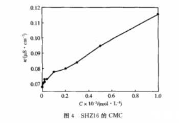 b.SHZ16的臨界膠束濃度為比SHZ14要低,這是由于SHZ16的碳?xì)滏湵萐HZ14稍長,導(dǎo)致疏水基之間的相互干擾減少,造成在表面的自組織能力增強(qiáng),表面吸附能力有所升高,從而使臨界膠束濃度降低。