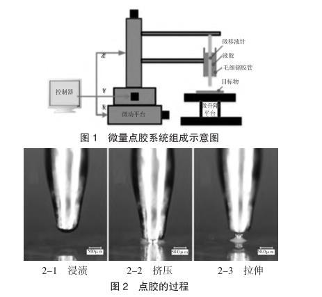 本課題組研制了一種基于移液針轉印原理的微量點膠系統,該點膠系統所形成的膠斑直徑可達到數十微米,膠滴體積可達飛升-皮升的范圍。該系統的結構如圖1所示。該系統由出膠單元、驅動單元和控制單元組成。其中,出膠單元為系統的核心,其主要包含微移液針和毛細儲膠管兩個關鍵元件,移液針通過在儲膠管內的上下往復運動,實現膠液向基板的微量轉移。驅動單元由X/Y/Z三個方向的驅動電機和微升降平臺組成,用于驅動微移液針及點膠工件的運動??刂茊卧蒔LC控制系統和LaBview開發的控制面板組成,實現對電機運動的自動控制。