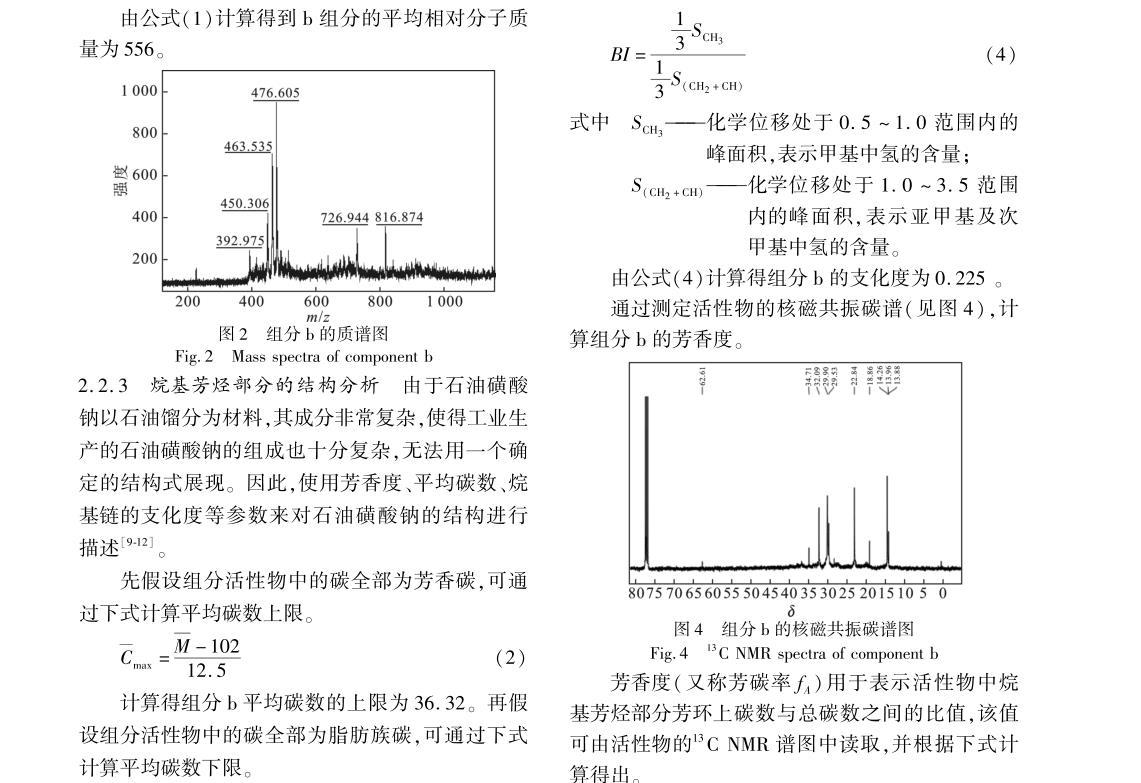 綜上所述,組分b的相對分子質量為556,平均每個分子中含有1~2個苯環,平均每個烷基側鏈含有25~29個碳原子,且平均每個烷基鏈含有4個支鏈。