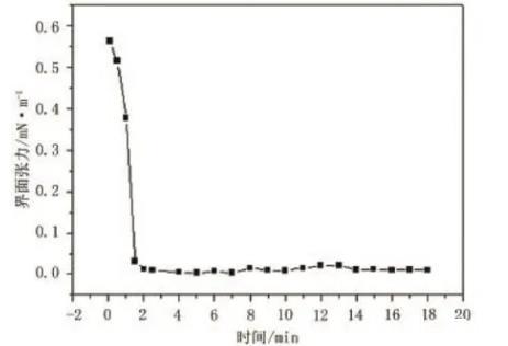 (3)飽和腰果酚聚氧乙烯醚磺酸鹽的界面活性。圖1為飽和腰果酚聚氧乙烯醚磺酸鹽的動態界面張力曲線。從圖1可看出,界面張力下降到最低點后基本不變,這是因為當溶液與原油接觸時,吸附速率大于脫附速率;隨著吸附量不斷增加,活性劑分子開始脫附。當活性劑分子在界面上的吸附速率與脫附速率相對平衡時,界面張力保持不變。