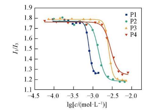 由圖3可見(jiàn),當(dāng)表面活性劑的濃度較低時(shí),I1/I3在1.70——1.80之間波動(dòng);當(dāng)表面活性劑濃度逐漸增加至cmc時(shí),I1/I3值急劇下降,說(shuō)明表面活性劑分子開始形成膠束,使得芘分子轉(zhuǎn)移至疏水膠束內(nèi),芘分子所處的環(huán)境極性發(fā)生突變;在較高表面活性劑濃度下,I1/I3值趨于穩(wěn)定,這是由于芘分子已經(jīng)完全處于膠束中,所處的環(huán)境極性不再發(fā)生變化。通過(guò)Boltzmann方程擬合得到表面活性劑P1,P2,P3和P4的cmc值分別為7.96×10-4,1.39×10-3,2.57×10-3和2.85×10-3 mol/L。結(jié)果表明,隨著聚氧乙烯鏈長(zhǎng)度的增加,cmc逐漸增大。采用熒光法測(cè)得的cmc與采用表面張力法測(cè)得的cmc數(shù)值接近且變化趨勢(shì)一致。