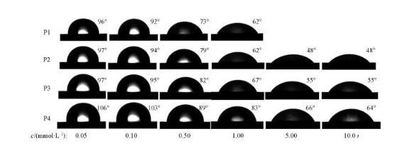 由圖2可知,P1,P2,P3和P4的cmc分別為8.51×10-4,1.44×10-3,2.27×10-3和2.72×10-3 mol/L;γcmc分別為27.97,27.19,27.49和31.19 mN/m.可見(jiàn),隨著聚氧乙烯鏈長(zhǎng)度的增加,4種非離子Gemini表面活性劑的cmc逐漸增加,這是由于隨著聚氧乙烯鏈長(zhǎng)度的增加,表面活性劑的疏水作用減弱,不利于膠束的形成。γcmc隨著聚氧乙烯鏈長(zhǎng)度的增加先減小后增加,其中P2的γcmc最低,為27.19 mN/m,這可能是由于P2分子內(nèi)部的親水性和疏水性達(dá)到了平衡,能穩(wěn)定排列在氣/液界面上,降低表面張力的能力最強(qiáng)。P2,P3和P4的γcmc隨著聚氧乙烯鏈長(zhǎng)度的增加逐漸升高,這是由于親水性聚氧乙烯鏈長(zhǎng)度的增加使得表面活性劑分子在水溶液中卷曲程度增大,在界面處占據(jù)的空間增大,降低了分子在界面上的鋪展緊密度,從而導(dǎo)致γcmc升高。