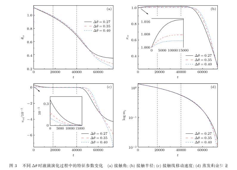 圖3(d)表明,接觸角遲滯加快了液滴的蒸干過程.當(dāng)t=74000時,Δθ=0.40情形下的液滴接近蒸干,此時液滴質(zhì)量為0.00479;而Δθ=0.27和0.35時的液滴質(zhì)量為0.01805和0.01009,分別約是Δθ=0.27情形下的3.77倍和2.11倍,即隨著遲滯角的增大,液滴剩余質(zhì)量減小(圖3(d)),液滴蒸干過程加快.