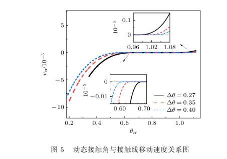 圖5比較了三種遲滯角下動態(tài)接觸角與接觸線移動速度間的對應(yīng)關(guān)系.可以看出,遲滯角對鋪展、釘扎和去釘扎階段等全過程均有不同程度的影響,在釘扎階段,Δθ=0.27下的液滴前進(jìn)接觸角和后退接觸角分別為θa=0.966和θr=0.696,Δθ=0.35和0.40下液滴對應(yīng)于θa=0.997,θr=0.647和θa=1.016,θr=0.616.如表2所列,隨著遲滯角的增大,前進(jìn)接觸角增大,后退接觸角減小,后退接觸角減小的幅度大于前進(jìn)接觸角增大的幅度,這與Karapetsas等的研究結(jié)果一致.因此,可通過改變遲滯角來改變前進(jìn)、后退接觸角,控制接觸線釘扎時間,從而調(diào)控液滴蒸發(fā).