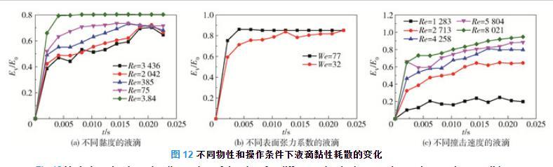 圖12(c)為液滴在不同撞擊速度下的黏性耗散情況。由圖5(b)可知,液滴的撞擊速度增加6.25倍時,液滴的最大鋪展線速度增加3.14倍,液滴內(nèi)部的速度梯度增加,則根據(jù)式(22)可得液滴在撞擊過程中的黏性耗散率和黏性耗散速率均隨著撞擊速度的增大而增大。