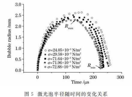 從圖5可以看出,表面張力減緩了空泡的膨脹過程。在初期,空泡膨脹變緩的現象不甚明顯,愈到后期越明顯。液體張力越大,空泡對應的最大泡半徑越?。槐砻鎻埩铀倭丝张莸氖湛s。表面張力越大,空泡收縮所能達到的最小泡半徑越小,且表面張力縮短了空泡脈動周期。從圖5還可以看出表面張力對空泡潰滅的影響要強于對膨脹的影響。此外,激光泡半徑隨表面張力變化與液體的表面張力數值并不為線性關系,其關系有待研究。