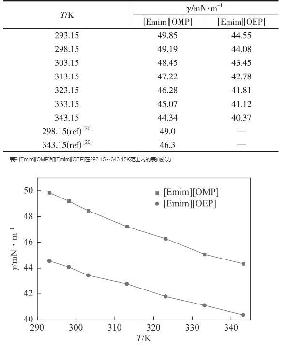 表面張力是一個(gè)對(duì)自由表面的物理和化學(xué)研究非常重要的性質(zhì),大部分離子液體的表面張力在30~60mN/m之間。[Emim][OMP]和[Emim][OEP]的表面張力實(shí)驗(yàn)值如表9和圖5所示。對(duì)于亞磷酸酯離子液體,[Emim][OMP]在某論文中報(bào)道的其表面張力數(shù)據(jù)與本文最大偏差值達(dá)到了1.96mN/m。分析原因在于不同的課題組使用不同的測(cè)量方法測(cè)量表面張力,從而使測(cè)量實(shí)驗(yàn)值產(chǎn)生較大的偏差。因此,對(duì)于表面張力的測(cè)定,要達(dá)到準(zhǔn)確可靠且具有復(fù)現(xiàn)性存在一定難度。