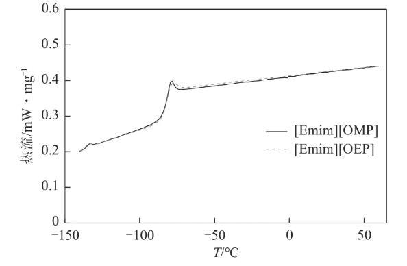 使用差示掃描量熱法對(duì)離子液體的固液相變進(jìn)行了研究(圖4),結(jié)果表明[Emim][OMP]與[Emim][OEP]不存在熔點(diǎn)或凝固點(diǎn),只有玻璃化轉(zhuǎn)變。[Emim][OMP]和[Emim][OEP]的Tg分別為-84.87℃和-85.00℃,即[Emim][OMP]與[Emim][OEP]并不存在真正意義上的固液相變,而只有冷卻或加熱過(guò)程中產(chǎn)生的無(wú)定形玻璃態(tài)與液態(tài)之間的轉(zhuǎn)變。