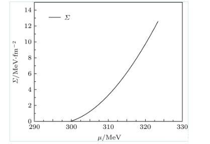 圖2 T=Tc時表面張力與夸克化學勢的演化關系