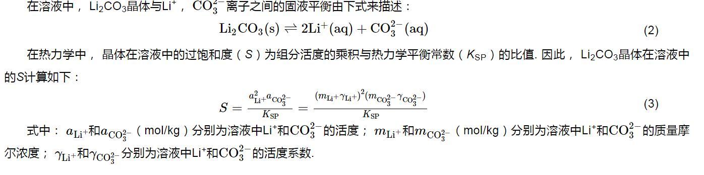 在熱力學中,晶體在溶液中的過飽和度(S)為組分活度的乘積與熱力學平衡常數(KSP)的比值.因此,Li2CO3晶體在溶液中的S計算如下: