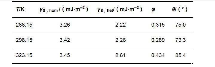 兩種成核機(jī)制時的固-液界面張力(γS,hom和γS,het)、形狀因子(φ)和接觸角(θ)的計算結(jié)果列于表2.可以看出,在同一溫度下,均相成核時的固-液界面張力大于非均相成核時的固-液界面張力;溫度對固-液界面張力的影響并不明顯,固-液界面張力只隨溫度的升高略有增加.